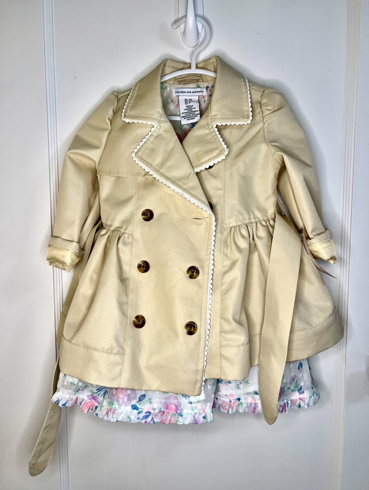 This darling 2-piece set by Cupcakes & Cashmere includes a soft floral dress with ruffle trim and a tailored cream trench coat with decorative buttons and lace-piped lapels. A polished and precious combo for spring portraits, Easter, or a special occasion.